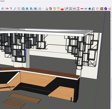 Con la imagen seleccionada en mano, realizamos el levantamiento completo del área del bar en 3D. Medimos cada rincón, cada esquina y cada obstáculo del lugar. Adaptamos el diseño elegido al espacio físico real, haciendo varias ediciones y ajustes hasta lograr una integración perfecta: los nichos iluminados quedaron exactamente donde debían, la barra fluyó con la arquitectura del local y los detalles de iluminación quedaron impecables.