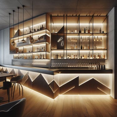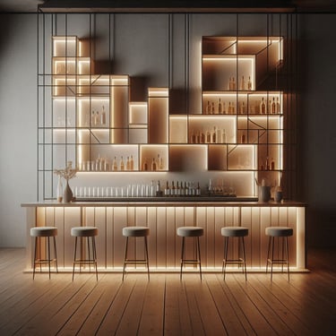 Como el concepto y el área eran muy complejos, decidimos recurrir a la inteligencia artificial justo cuando esta tecnología empezaba a despegar. Generamos decenas de imágenes con IA que interpretaran fielmente la visión del cliente. Presentamos las mejores propuestas (las que realmente “entendieron” el estilo, la iluminación cálida, los nichos iluminados y la barra con detalles LED).